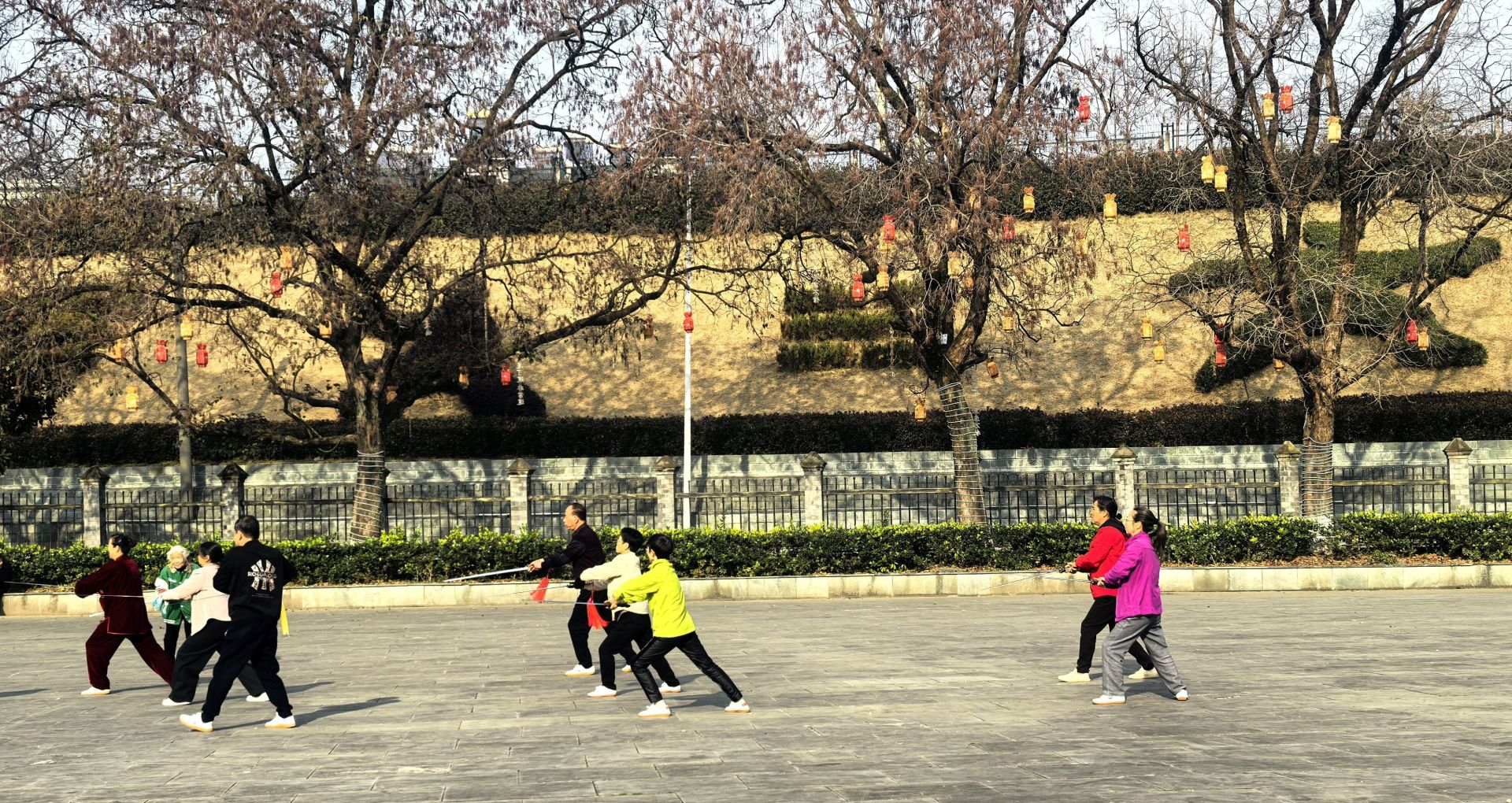玉虚宫前的青石广场上,悠扬乐曲随风飘散,市民手持长剑缓缓起势。一招一式舒展流畅,在暖阳下的吐纳呼吸中,尽得天人合一的悠远意境。55岁的张阿姨是这里的“铁杆粉丝”,她说:“练太极剑半年多,膝盖老毛病明显好转,每天来这儿晒着太阳练剑,比在家待着舒坦百倍!”