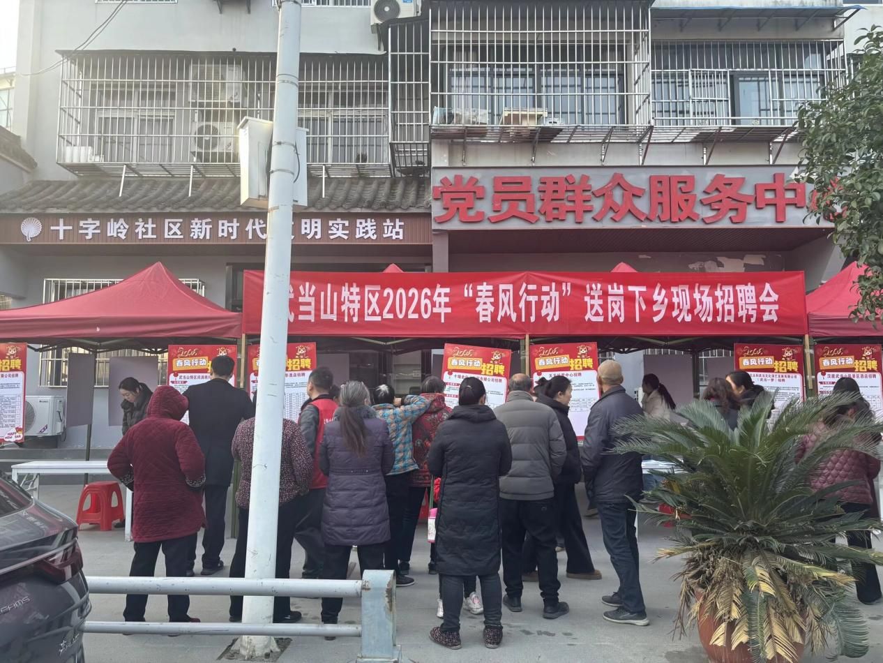 1月16日,2026年“春风行动”送岗下乡招聘活动在武当山十字岭社区开展,为返乡人员和闲置劳动力提供“家门口”就业服务,吸引80余名居民参加。