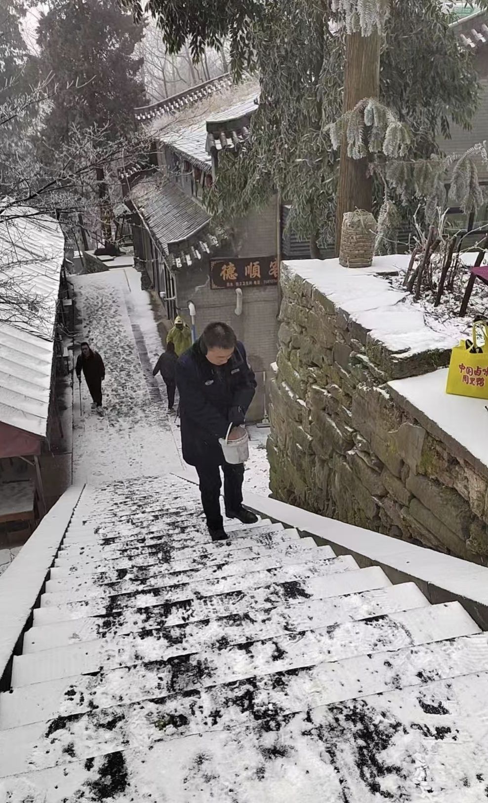 对琼台、太子坡等核心路段开展融雪除冰作业,通过撒布融雪盐开辟安全通道。开启古神道沿线广播设备,工作人员也手持扩音器,循环播放路面湿滑、有序下山等温馨提示。各辖区同步在游客集散地设置醒目提示牌,告知闭园安排与路面状况,提醒游客合理规划行程,提前返程,以免造成滞留。