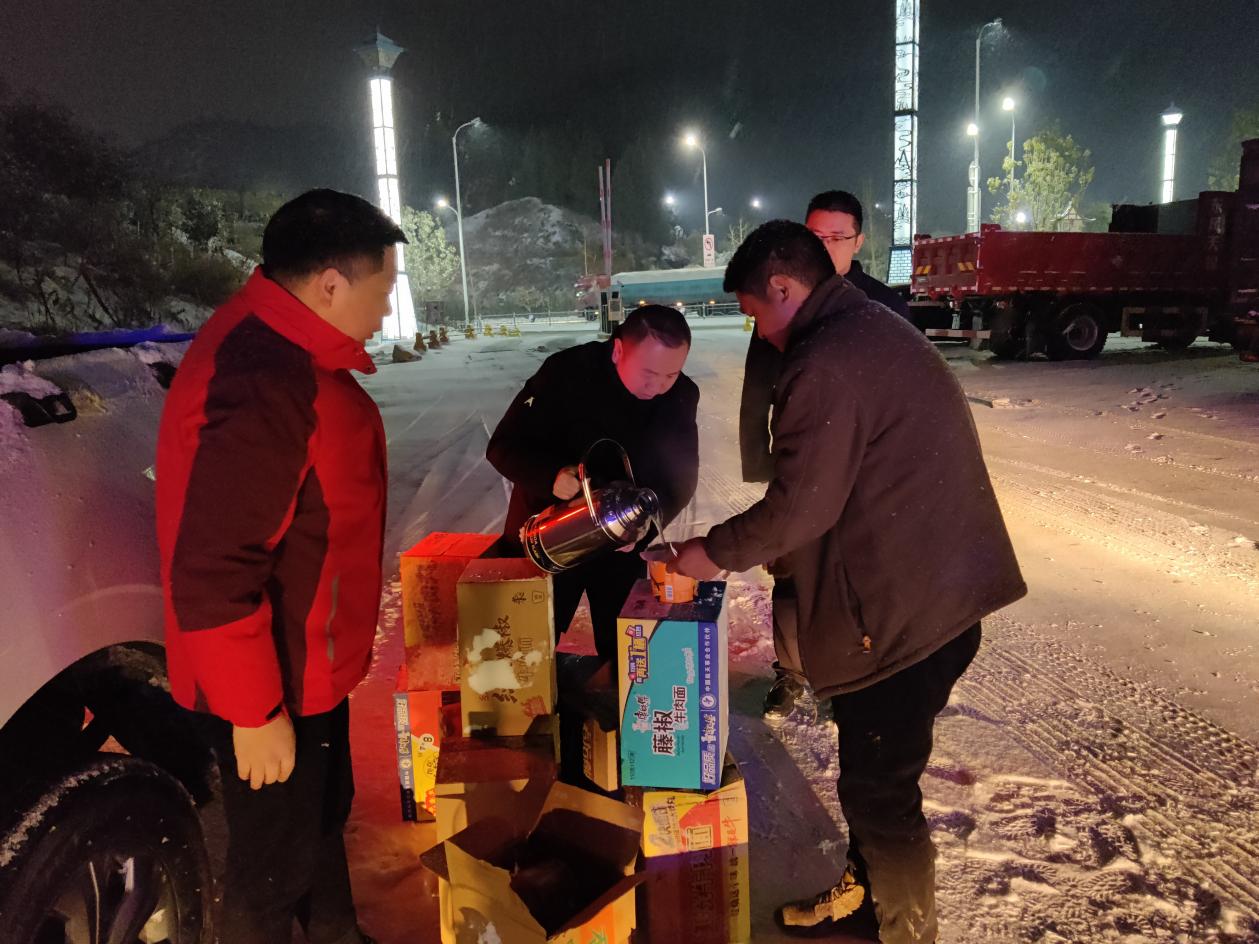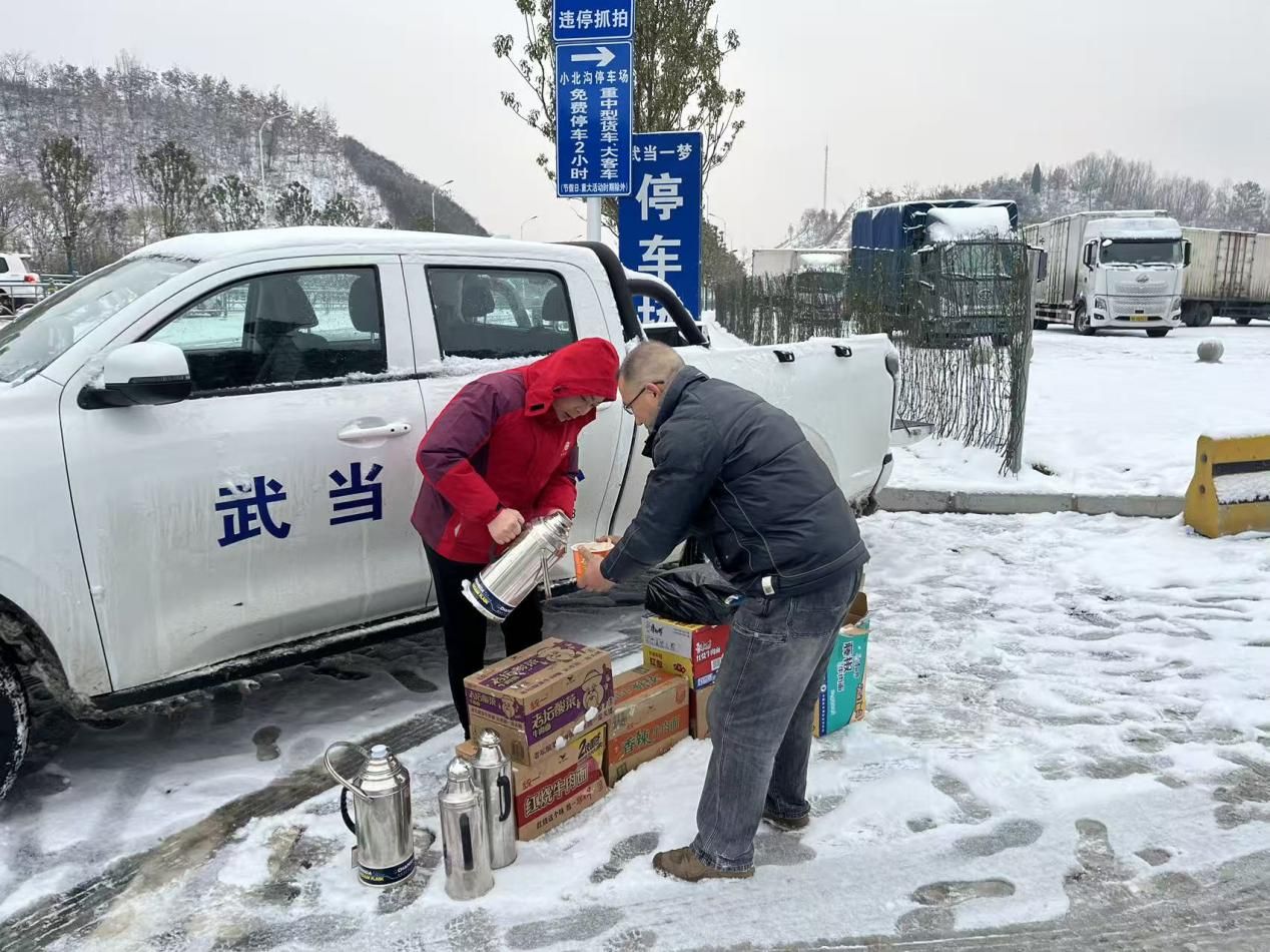 面对突发状况,武当山特区迅速启动应急响应机制,统筹街道办事处、公安、应急等部门力量,第一时间组建了服务队伍,紧急调集30箱泡面和50瓶热水等各类应急物资火速奔赴现场。抵达滞留点后,工作人员不顾–5℃的严寒,立即将一杯杯滚烫的开水、一桶桶热气腾腾的泡面逐一送到每一位受困人员手中。来自湖北襄阳的司机李师傅接过热水感动不已:“雪天被困本来心里又急又慌,没想到武当山的干部这么快就赶来帮我们解决困难,这份温暖太及时了!”