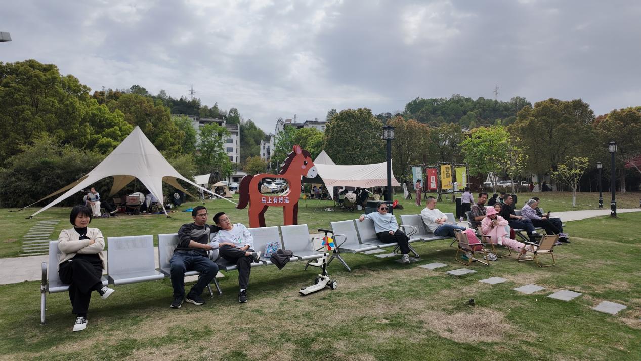 草坪上,一顶顶露营帐篷错落有致,市民游客围坐在一起喝茶聊天、分享美食,用手机记录美好瞬间。舞台区域,驻唱歌手带来一首首经典歌曲,悠扬的歌声随风飘荡,不少游客驻足聆听、跟着哼唱,现场气氛轻松热烈。亲子游玩区格外温馨,孩子们奔跑嬉戏、放飞风筝,家长们陪伴在旁,享受惬意的亲子时光。