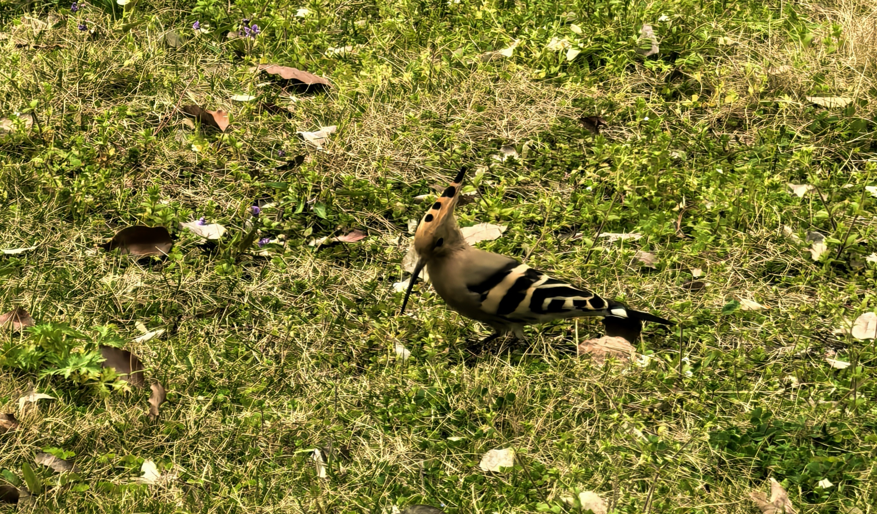 4月6日,有市民在武当山玉虚宫散步时,意外发现几只国家二级保护动物戴胜鸟。它们悠闲地穿梭在草丛间,细长的喙不时刨啄土壤,专注地搜寻小虫。