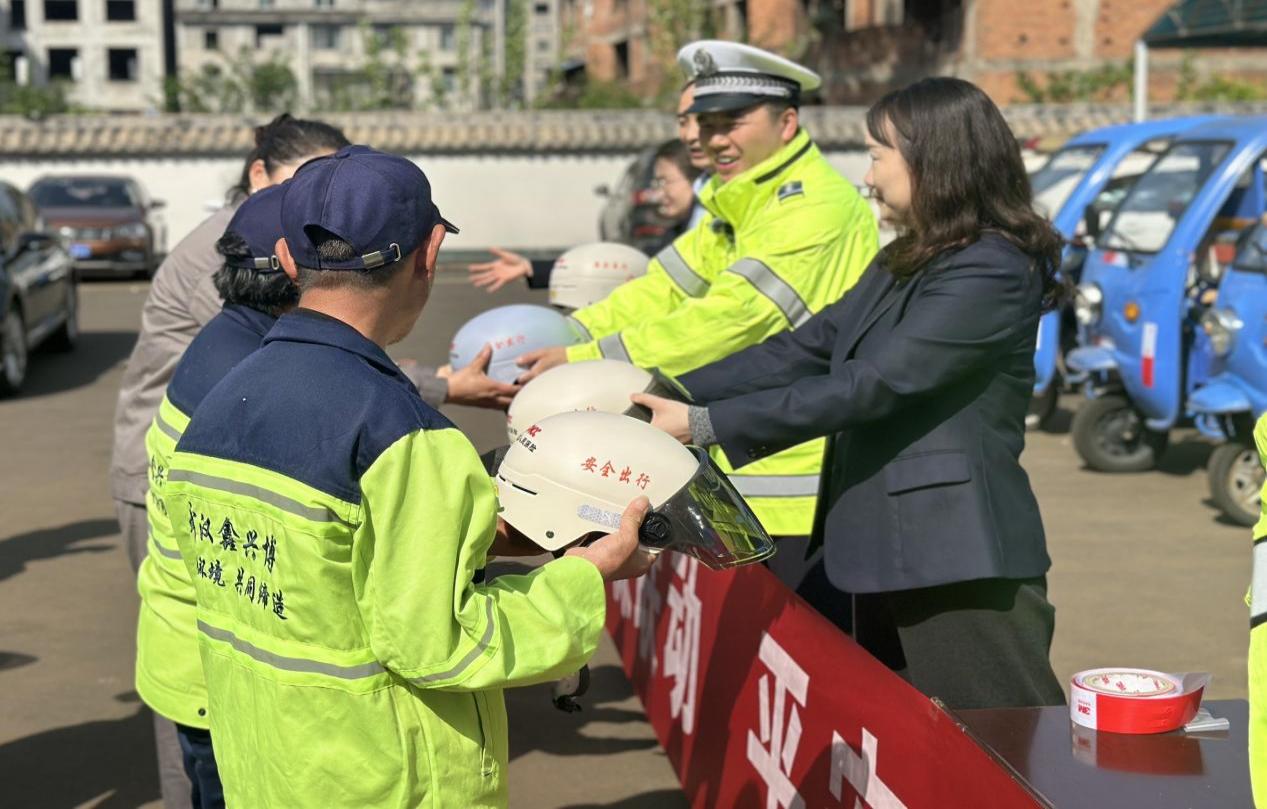活动现场,民警通过观看警示教育片、以案说法等方式,重点讲解环卫清扫作业、早晚高峰出行、横穿路口等环节存在的安全风险,普及作业防护规范和避险常识,提升环卫工人安全防范意识。同时,发放安全头盔20个,为环卫作业车辆粘贴反光标识,提升车辆夜间行驶安全性。